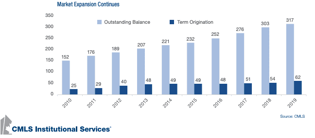 The CMLS Mortgage Analytics Group (MAG) recently completed its 10th annual survey of the Canadian Commercial Mortgage Lending market. This year’s survey marked our highest participation rate to-date, with 37 different lenders participating and about 90% of the market covered. As of the end of 2019, our survey indicates the Canadian Commercial Mortgage market sits at $317 billion in outstanding loans, up from $303 billion at the end of 2018. New origination in 2019 (which excludes construction loans) came in at $62 billion, a 15% increase over last year’s total.
