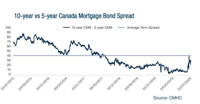 On March 24th, CMHC purchased $5 billion in 5-year insured mortgage pools as part of the IMPP. To date, there have been no comparable purchase programs announced in the 10-year CMHC space, leading to a notable lack of funding for longer duration loans.