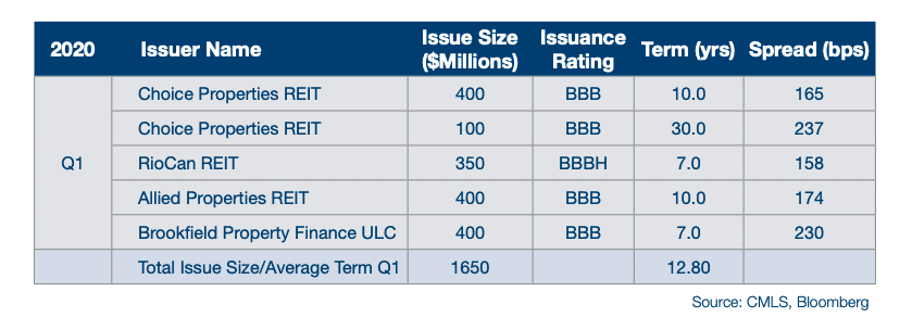 The S&P/TSX Capped REIT Index closed the quarter down 27.47% from the start of 2020. In the US, the MSCI US REIT Index was down 26.99% over the same period. The impact on the debt side of Canadian REIT’s has also been substantial. Yields on existing unsecured debentures increased by more than 100% month-over-month to end the quarter, according to data from our proprietary index.