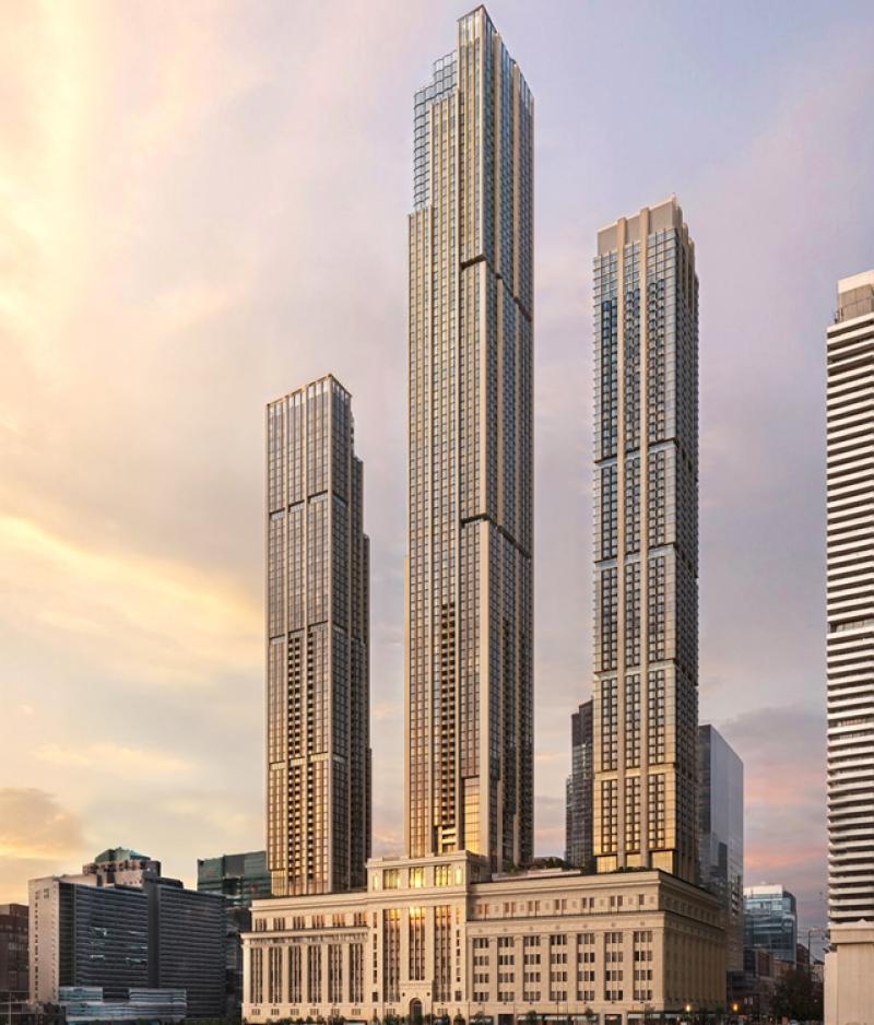 The proposed towers would stand 96, 75 and 65 storeys with the tallest hitting 333.3 metres, just over 1,000 feet, the spokesperson told RENX. The project is to contain 2.54 million square feet of space, most of it devoted to new housing components. The podium will range up to 12 storeys.