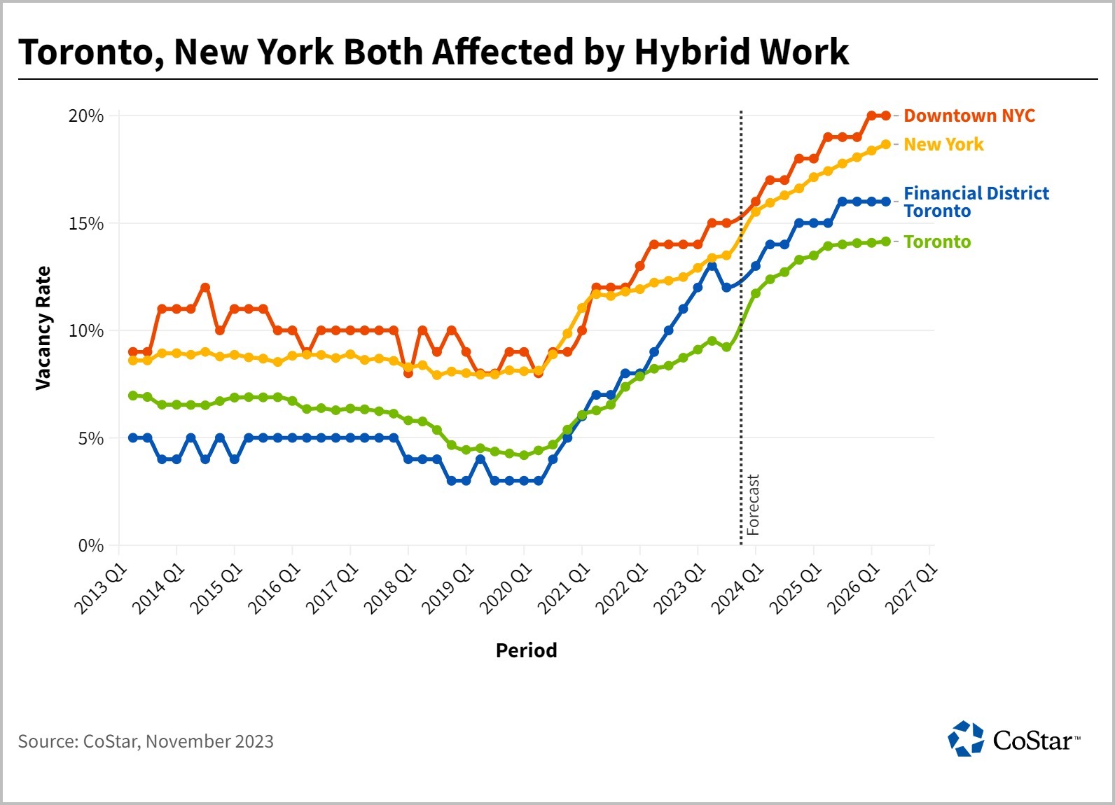 The North American office market has been affected by the adoption of hybrid work policies as well as slowing office-using employment growth. In both Toronto and New York, the average office vacancy has climbed by roughly 500 basis points compared to pre-pandemic levels. Moreover, major Class A office nodes, such as Downtown New York City and the Financial Core in Toronto, have witnessed weaker leasing fundamentals relative to their respective markets.